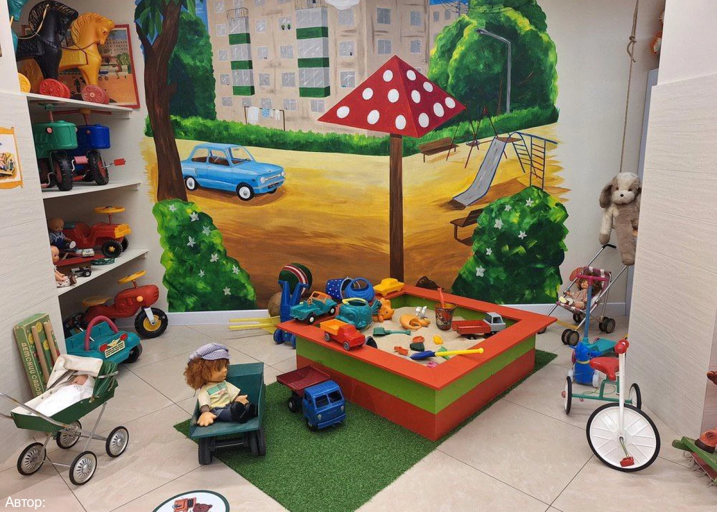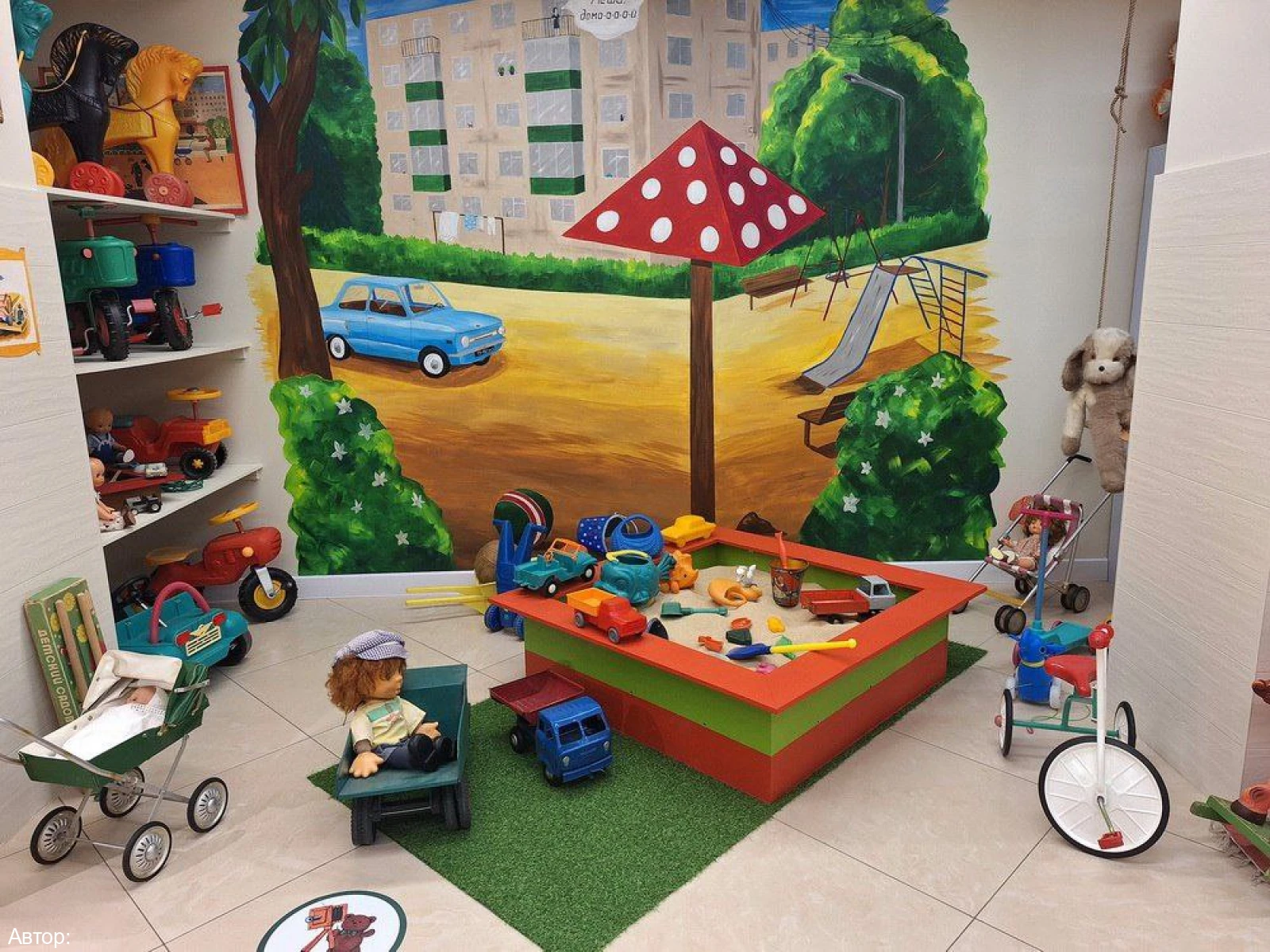 - двор с настоящей песочницей под грибком, где дети проводили всё своё свободное время. Здесь же вспоминаем, в какие дворовые игры играли, как делились игрушками и как родители звали домой;