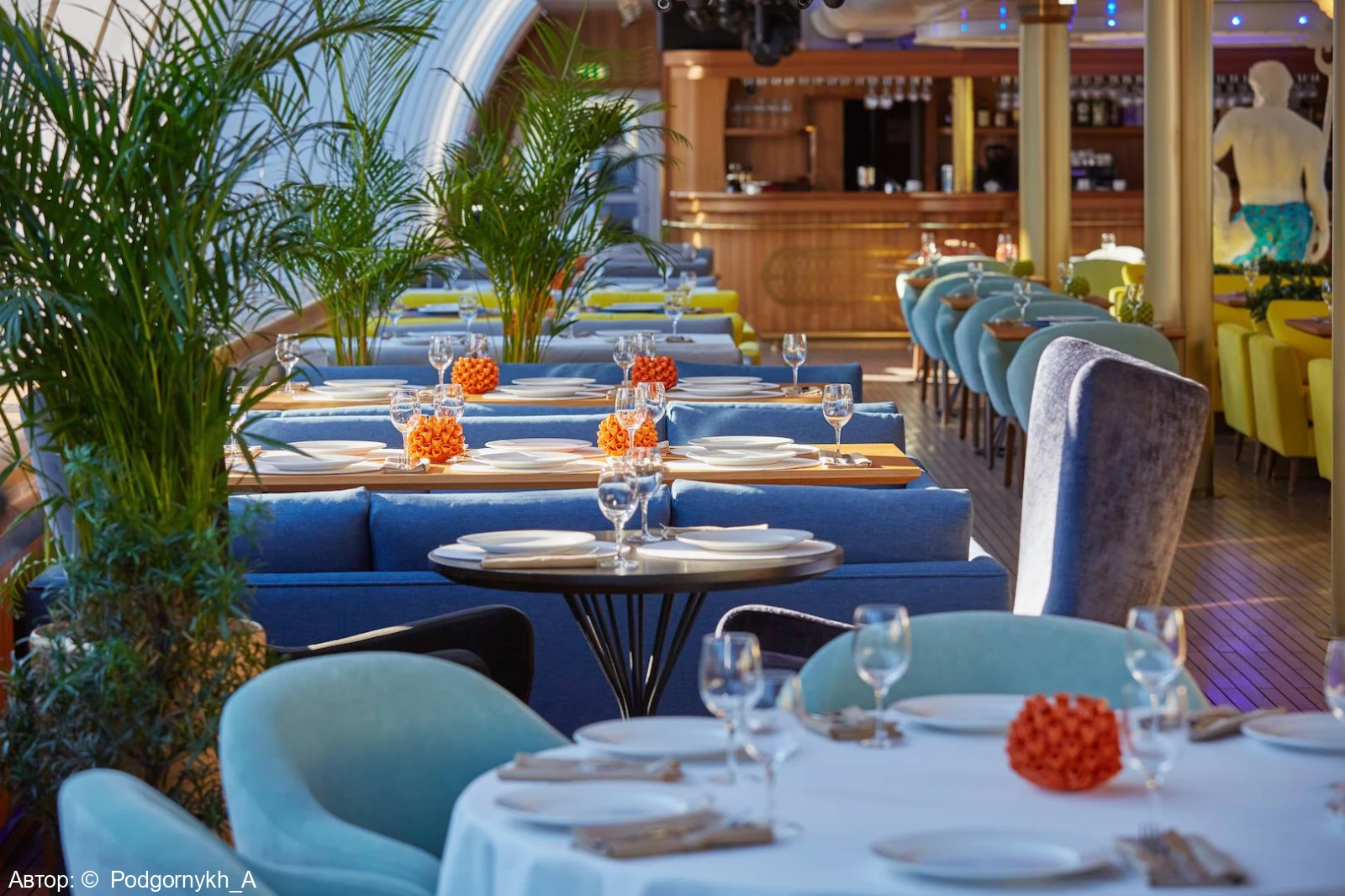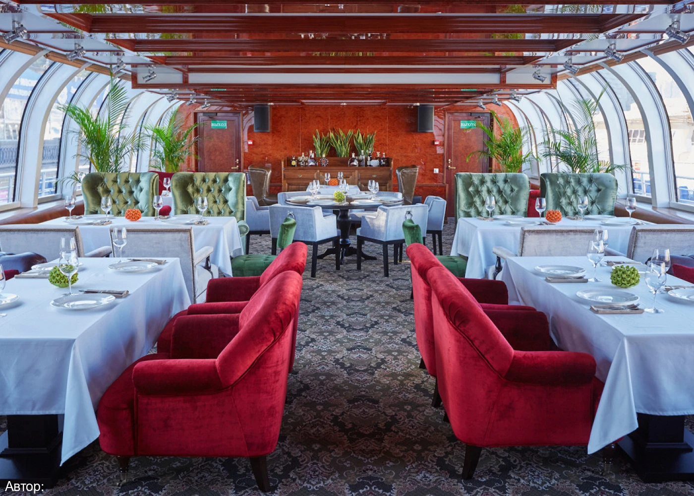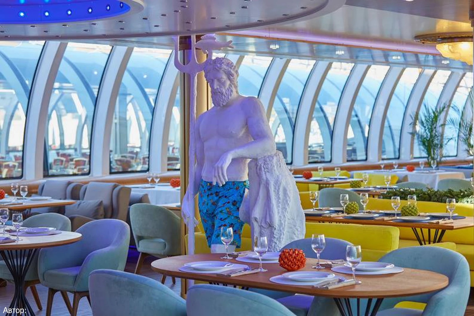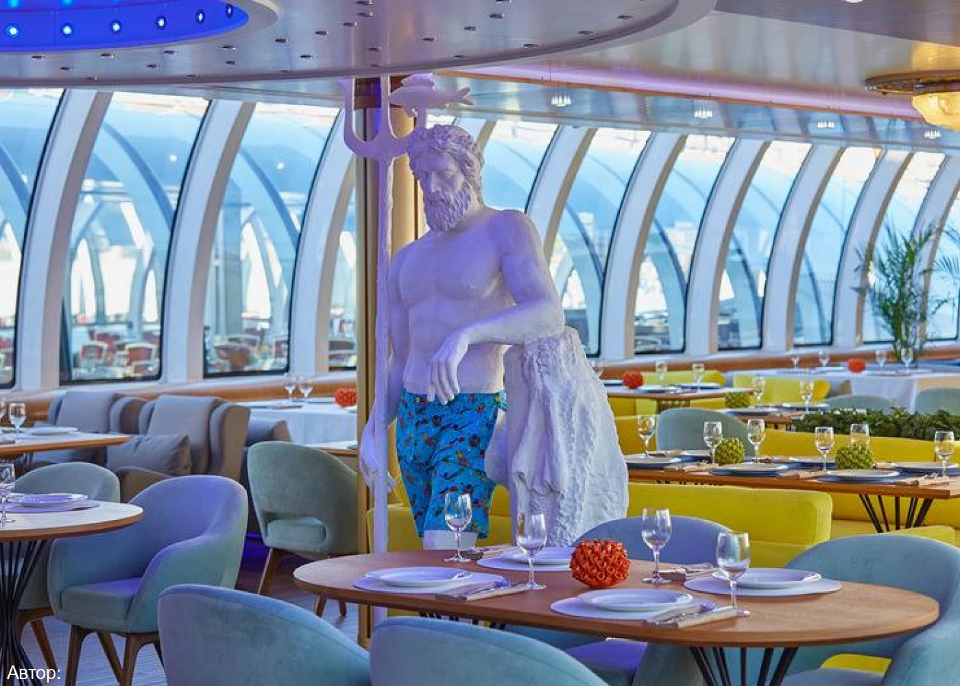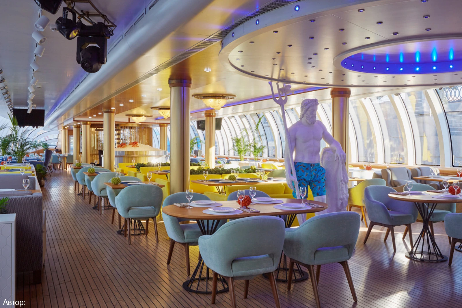 Курсирующий по реке Москве рэдиссон теплоход оформлен в сказочном морском стиле. В оформлении интерьера салона удачно подобрана цветовая гамма. Ресторан украшают светильники в виде осьминогов и морских звезд, в центре зала расположился сам Повелитель морей.