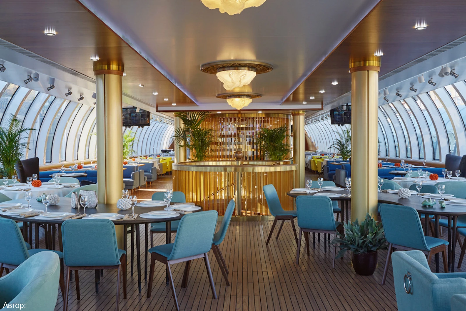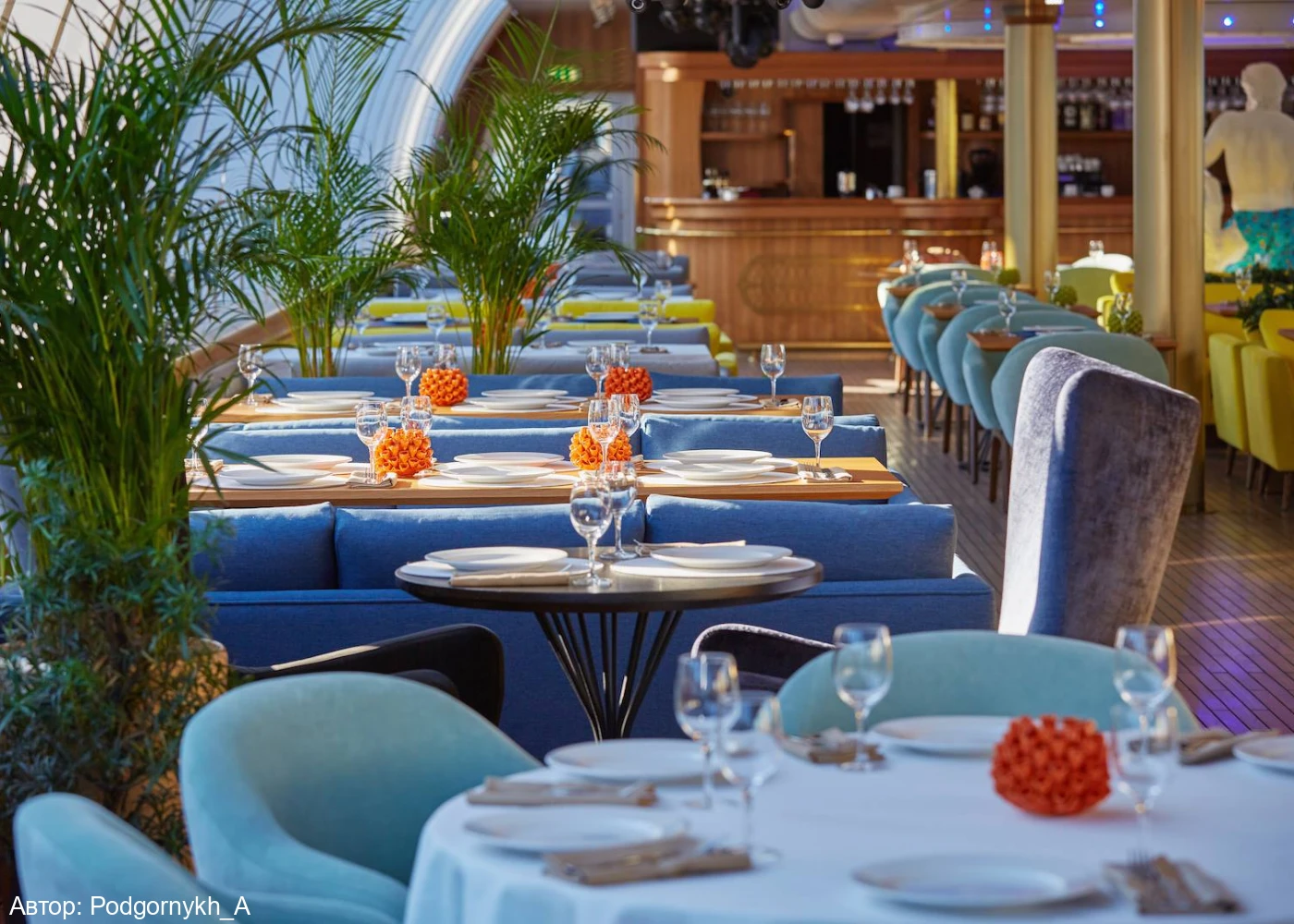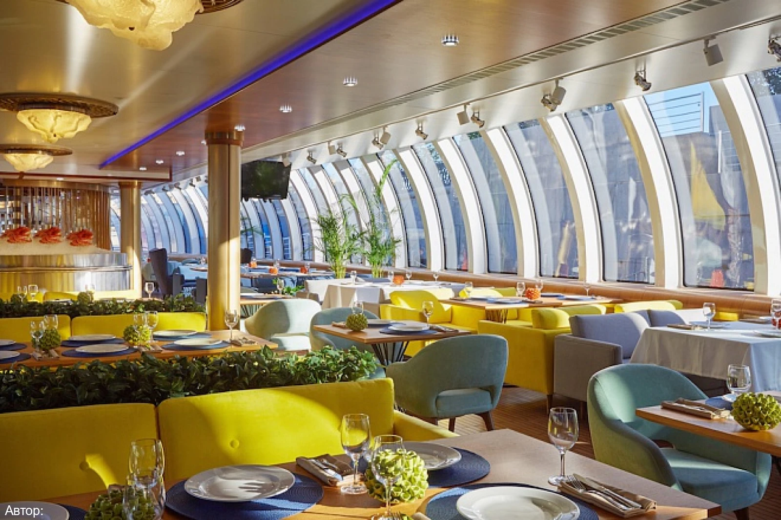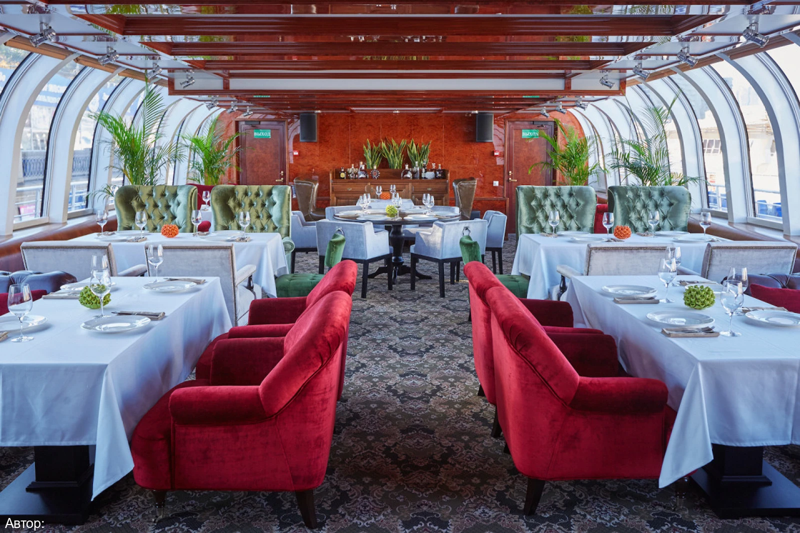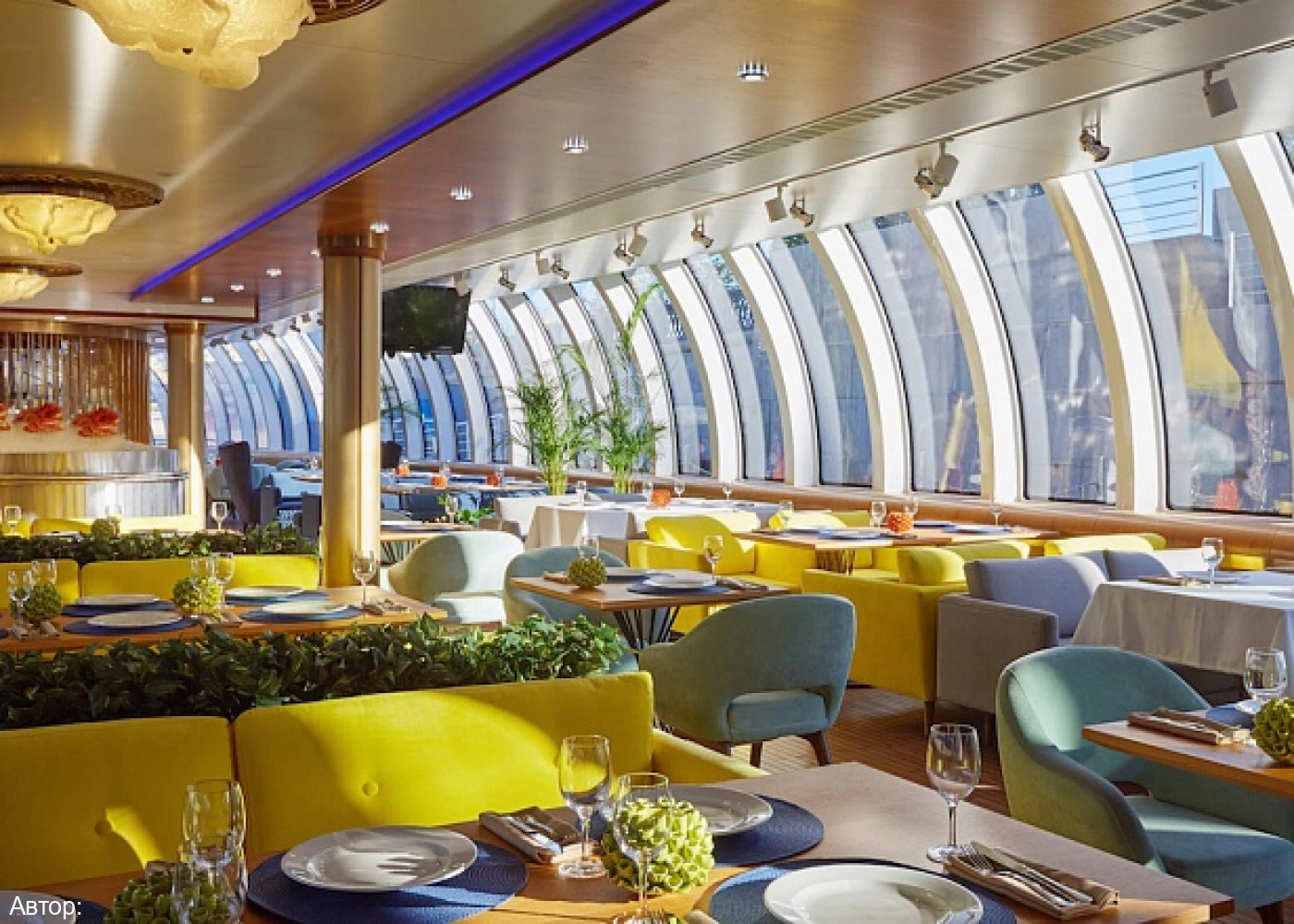 Курсирующий по реке Москве рэдиссон теплоход оформлен в сказочном морском стиле. В оформлении интерьера салона удачно подобрана цветовая гамма. Ресторан украшают светильники в виде осьминогов и морских звезд, в центре зала расположился сам Повелитель морей.