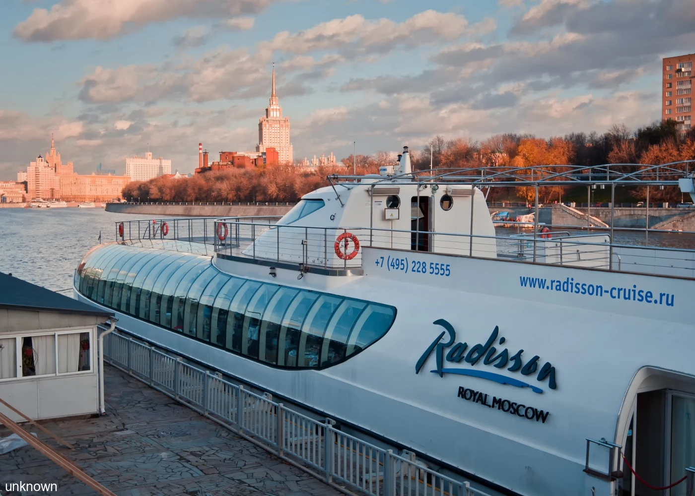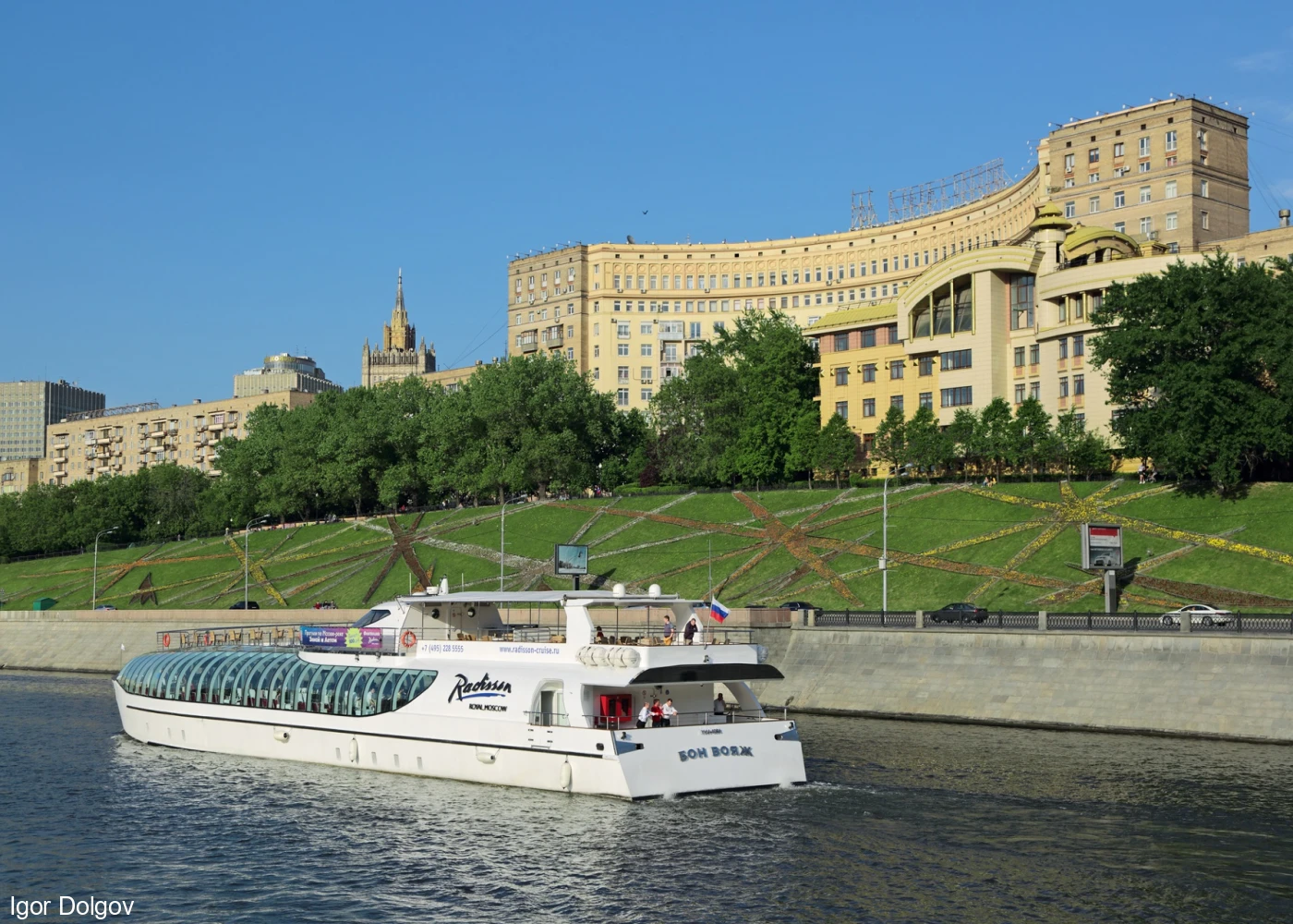 Маршрут от парка Горького проложен так, что при любом взгляде в окно, в зоне видимости оказывается какой-нибудь интересный объект. Теплоход рэдиссон, продвигаясь по Москве реке, пройдет около памятника Петру I; вдоль кремлевской стены, недалеко от стадиона «Лужники», Новодевичьего монастыря, Дома правительства.